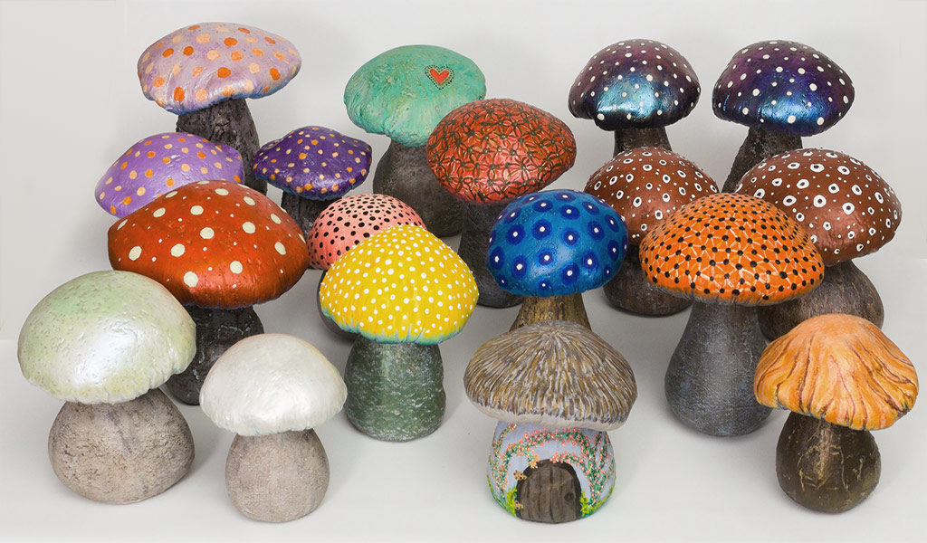 Each mushroom requires approximately 2 months from start to its completion, which includes sculpting, drying, 2 curing periods and simple painting (more detailed painting takes more time).
